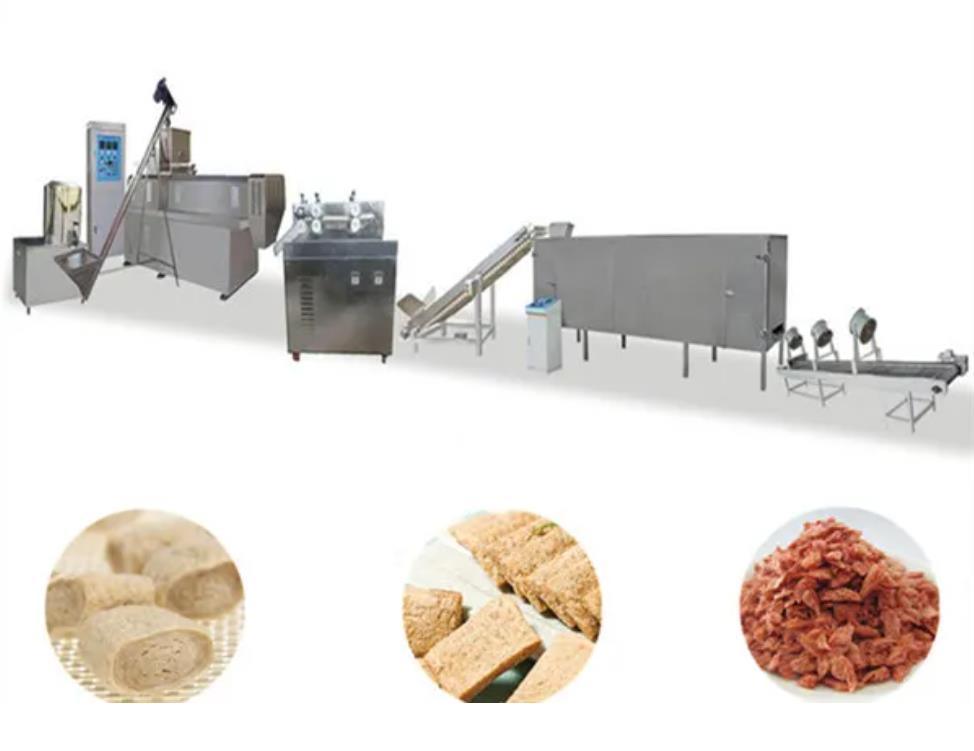 このラインは原料として脱脂された大豆食事およびピーナツ食事を取ります。、突き出、混合の後で、切れ、そして乾燥して、食事は層繊維の質になります。完成品に高蛋白があります;肉のように見え、味がして下さい;引きつけられるオイル、水および味に容易;コレステロールそして動物性脂肪なしで、従ってそれは肉製品の企業で広く利用されています、ファースト・フードの生産、急速冷凍された食料生産およびいろいろな種類の菜食主義の軽食および食糧。
